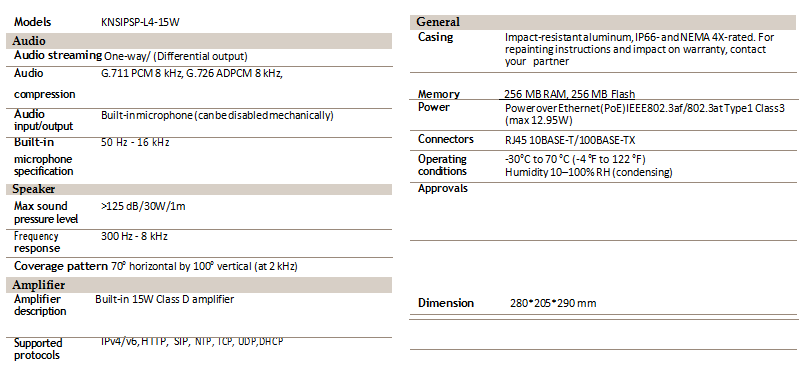 The outdoor-ready KNSIPSP-L4-15W is easy to install. The loudspeaker has a built-in amplifier and supports over over Ethernet. It connects directly to an IP network with one network cable for communication. It is powered supply by POE. KNSIPSP-L4-15W enables a high sound pressure exceeding 109~125 dB. Being a standalone unit, KNSIPSP-L4-15W can be placed anywhere, enabling a flexible, scalable and cost-effective approach to system design.