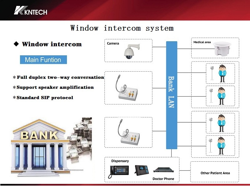 Security window intercom system that provides hands-free communication for VOX operation between the customer and the person opposite the security glass. The system uses speaker drivers and acoustic tubes to provide communication without compromising the integrity of the glass. Window intercom systems can be used in banks, ticket counters or any other area where there is a window between interlocutors.