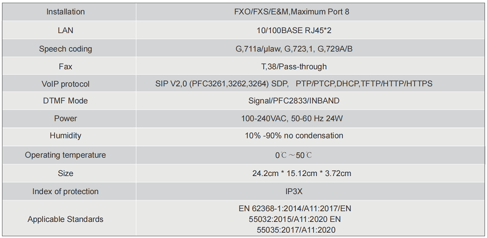 Supports a variety of voice codecs, including G,711A/u,G,7231 high/low, and G,729, This ensures that calls are clear and reliable,even over long distances.