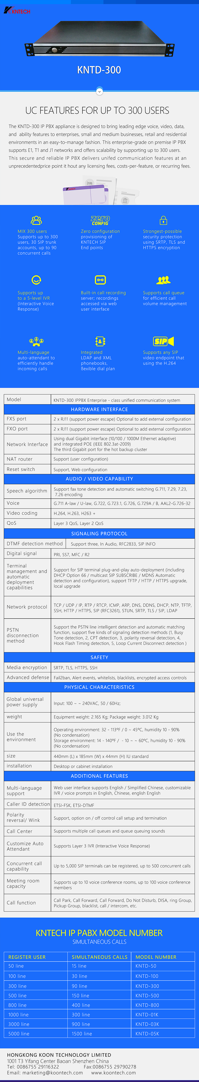تم تصميم جهاز KNTD-300 IP PBX ليوفر ميزات الصوت والفيديو والبيانات والقدرات الرائدة للشركات والمؤسسات الصغيرة والمتوسطة ، وبيئات البيع بالتجزئة والبيئات السكنية بطريقة سهلة الإدارة. يدعم هذا البرنامج على مستوى المؤسسة IP PBX شبكات E1 و T1 و J1 وقابلية التوسع من خلال دعم ما يصل إلى 300 مستخدم. يوفر هذا IP PBX الآمنة والموثوق بها ميزات اتصال غير متحركة بسعر غير مسبوق ، حيث يقوم بضغط أي رسوم ترخيص أو تكاليف لكل ميزة أو رسوم متكررة.