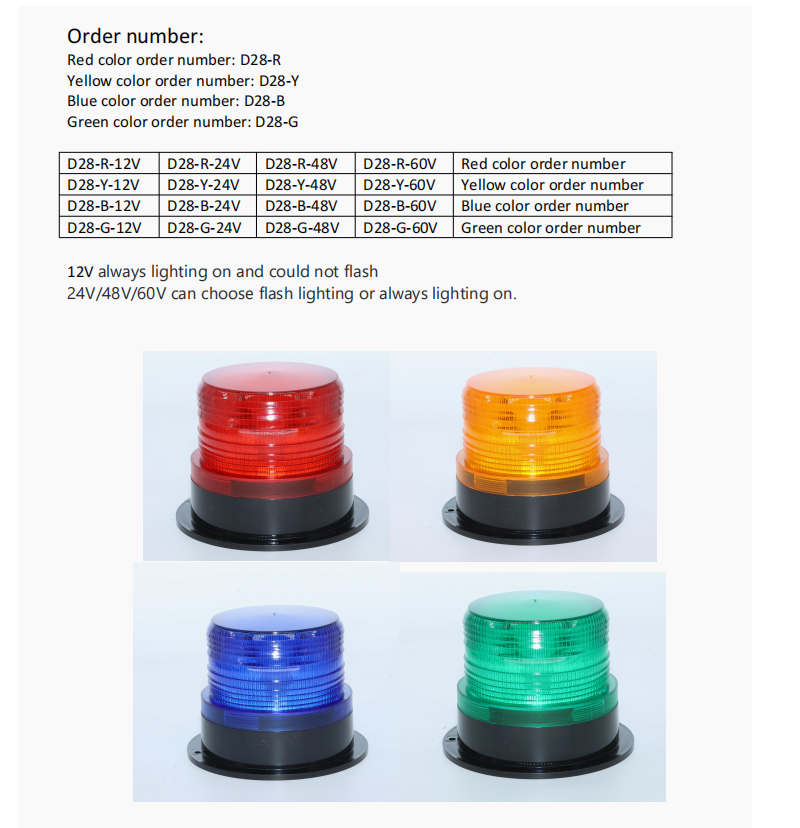 D28 LED beacon high brightness LED lamp and intelligent IC control function,shadewith focusfunction,moreflashbrightness,betterquality,runningstabler. Usedin electricalpower, telecommunications,machine tools,shipbuilding,printing,mining machineryandotherequipment forindicationsignal,notice thesignal, accidentsignal.
