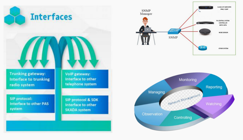 The NMS server software is based on the BS structure. The installation and operation environment is a Linux server. It is accessed through the web browser WEB-GUI.The system performs network management on all devices in the system based on the SNMP protocol. The management objects include PA Server, PA Console, PA automatic control box,IP Power amplifier, Noise sensor, etc., all device connect to the system. The management content includes: map navigation to quickly locate the location of each device, real-time view of the health status of each managed object, and any alarms in the device and PA Server are reported immediately.