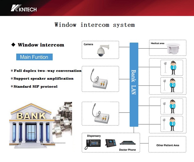 According to the actual needs of the scene, all bank service windows must be equipped with bulletproof glass, which causes inconvenience to the conversation inside and outside the windows. Because of this, the window intercom system came into being. The window intercom system can better help the bank staff to serve customers, and the window intercom can clearly communicate with customers.