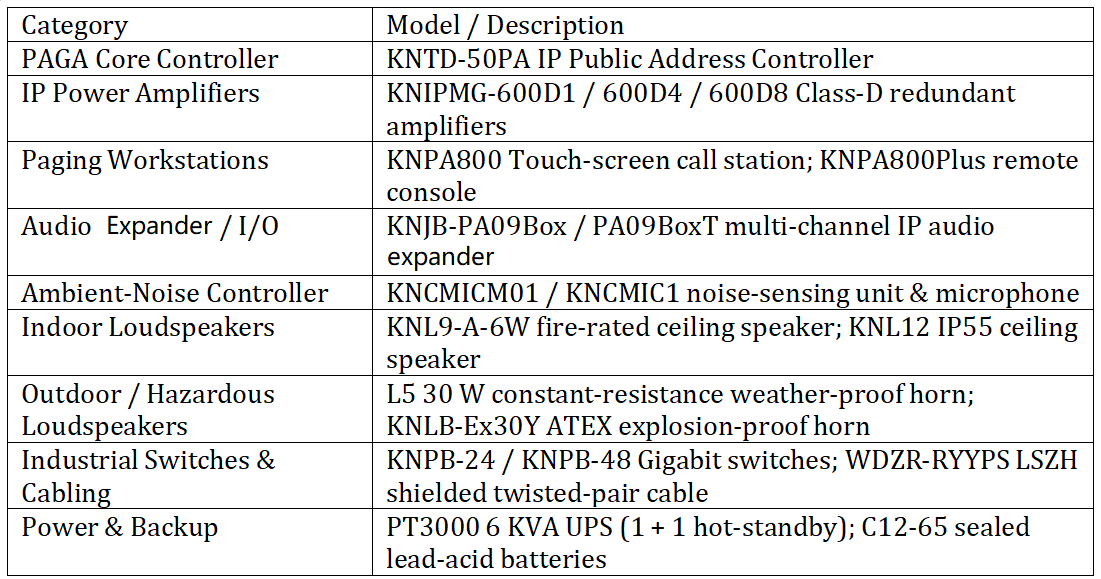 KAR Group’s Erbil Refinery is a mission‑critical petrochemical complex operating in a high‑temperature, dusty, and potentially explosive atmosphere. The client required a plant‑wide PAGA system that would guarantee clear voice and alarm coverage, comply with ATEX/IECEx and EN 54‑16 safety standards, and integrate seamlessly with the Distributed Control System (DCS), telephony, and security subsystems. KNTECH, acting as EPC consortium leader, delivered a full turnkey solution covering system design, equipment supply, factory integration, on‑site installation, commissioning, SAT, and operator training.