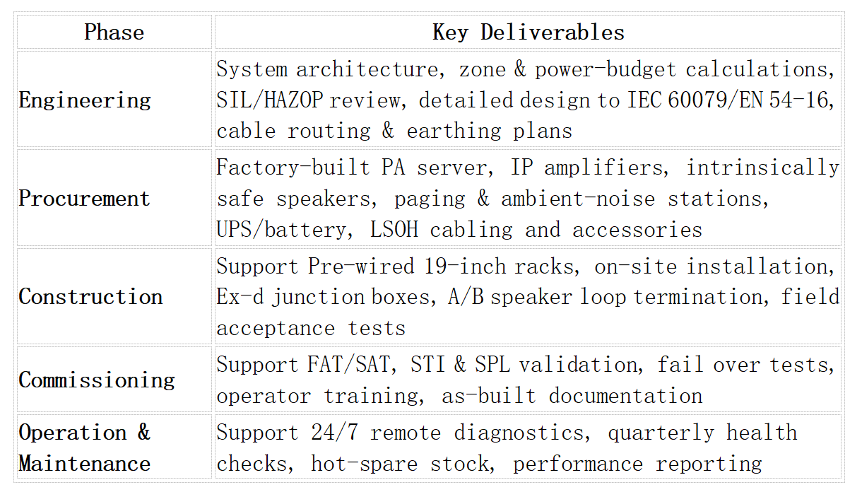 Construction:Support Pre wired 19-inch racks, on site installation,Ex-d junction boxes, A/B speaker loop termination, fieldacceptance tests.