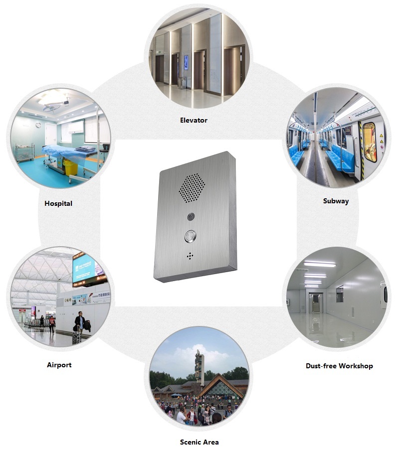 Aplicaciones: Como teléfono público para interiores o exteriores, teléfonos de ascensores, taxis o paradas de autobuses o estaciones, buzón de llamadas de la autopista. Ferrocarril, metro, cajeros automáticos, túneles, puertos, muelles, minas, instalaciones de generación….