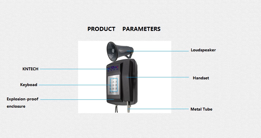 Amplificación industrial Kntech. El teléfono KNSP - 18L está diseñado para ser resistente a la humedad, prevención de incendios, ruido, polvo, anticongelante, prevención destructiva, tiene requisitos especiales, como investigación y desarrollo ambiental, mediante la adopción de forjado de materiales SMC importados y el chasis puede convertirse en 180 grados resistencia a altas temperaturas, baja temperatura a 60-80 grados, la superficie de la máquina no produce teléfono estático, la carcasa es resistente a la luz, resistencia a las pruebas de alta y baja temperatura, resistente al calor y muchas otras pruebas durante más de 100 días - libre, la máquina puede ser adecuada para trabajos estables de 30 grados bajo cero a 75 grados por encima del ambiente de congelación, aplicar a más de 90 db ambiente de temperatura de ruido. Como taller de acero, planta de preparación de carbón, salas de plantas de energía, minas, túneles, etc. .